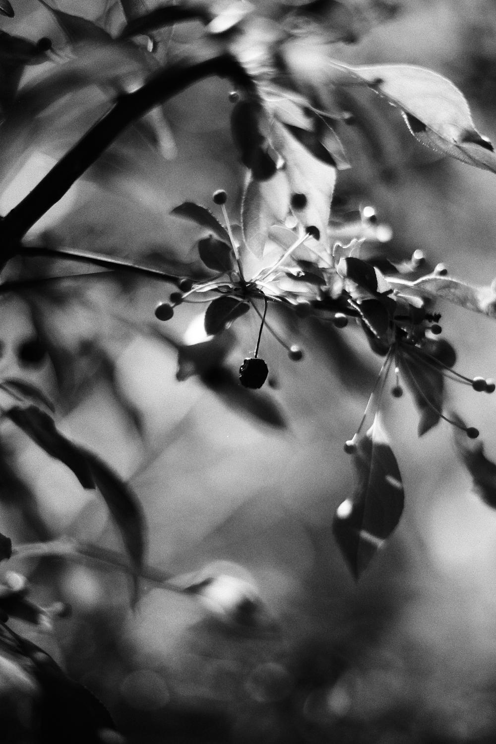 Austere, dreamy, high-contrast scene of small berries and buds in a tree.