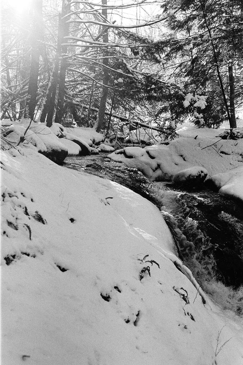 Snowy winter landscape scene of a small waterfall in a Maine forest.