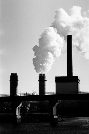 Billowing smoke over backlit smokestacks.
