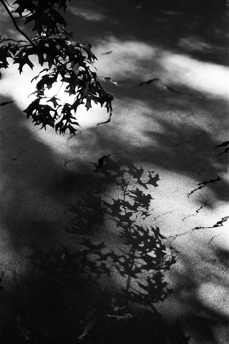 Oak leaves and their shadow over a duckweed covered pond in Cambridge, Massachusetts.